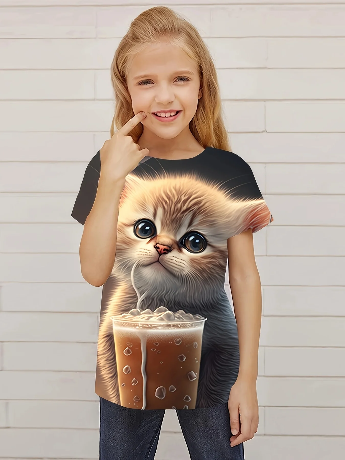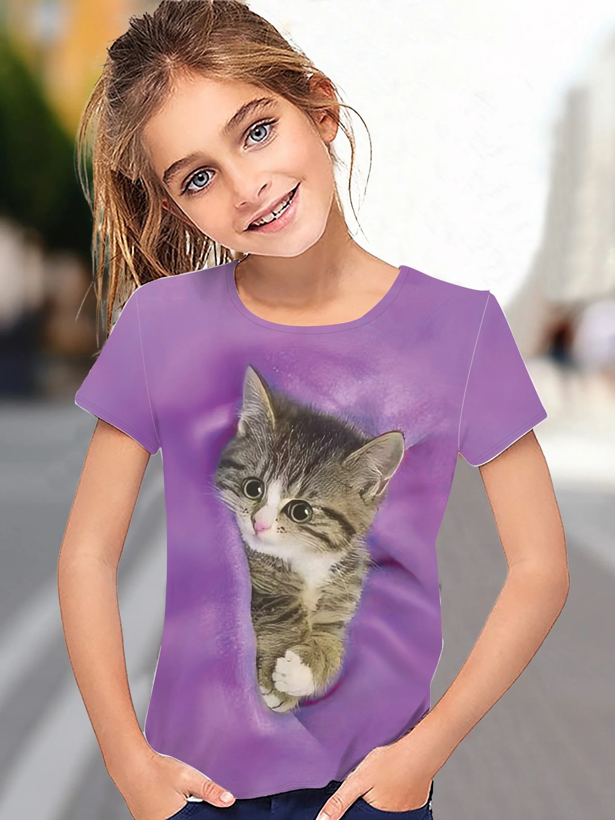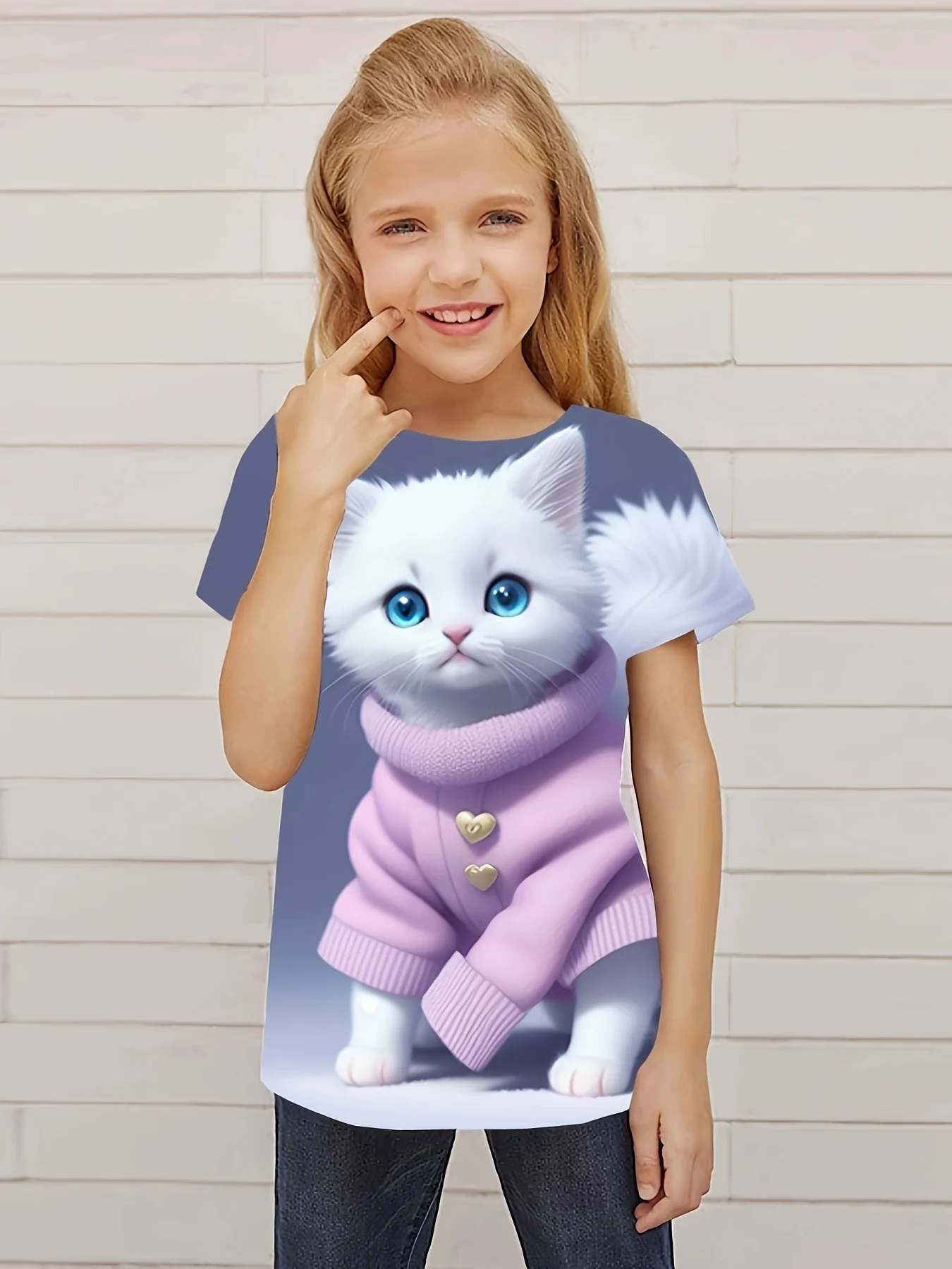 Adorable Kitten Graphic Print Kids T-Shirt Crew Neck Short Sleeve Tops Casual T-Shirt for Children Girl Summer Outdoor Sports