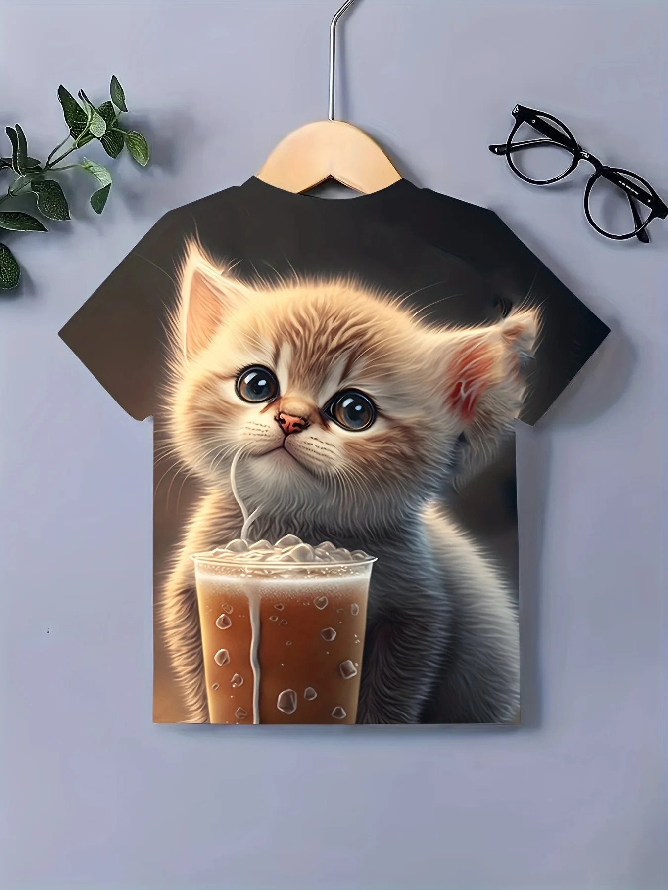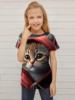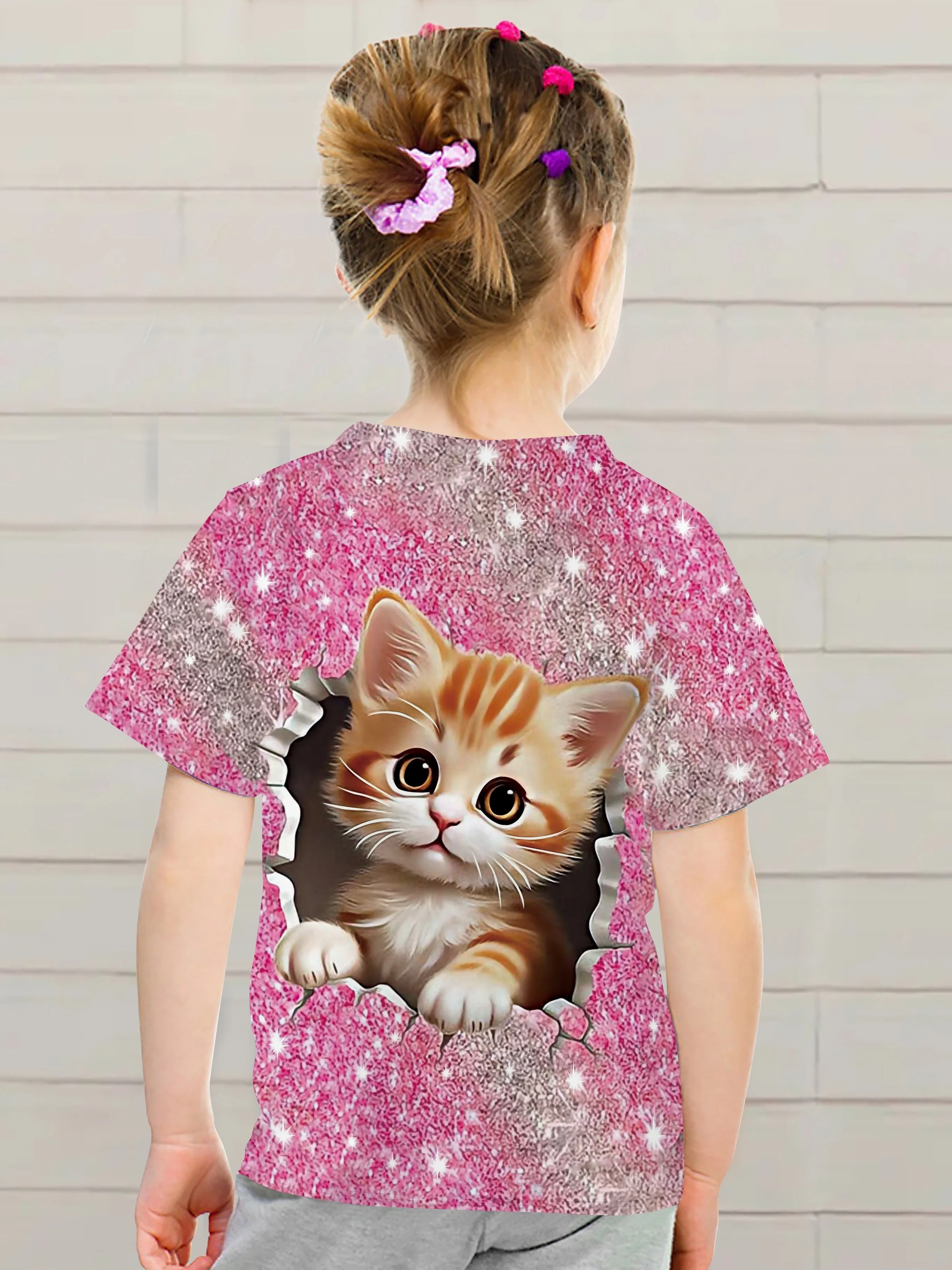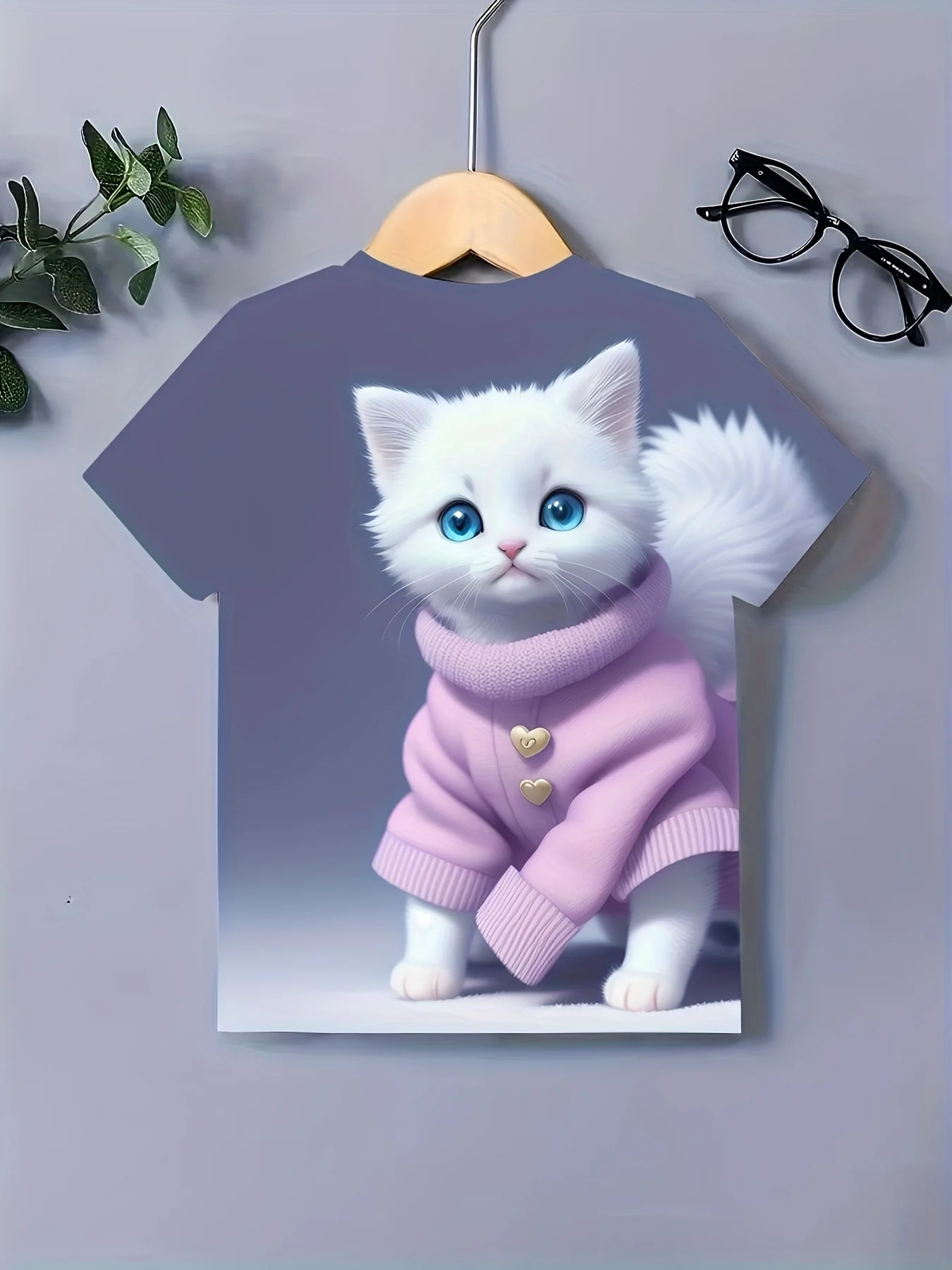 Adorable Kitten Graphic Print Kids T-Shirt Crew Neck Short Sleeve Tops Casual T-Shirt for Children Girl Summer Outdoor Sports