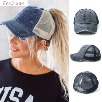 Vintage Ponytail Baseball Cap Women Adjustable Snapback Hat Mesh Distressed Summer Cap Woman Sunhat