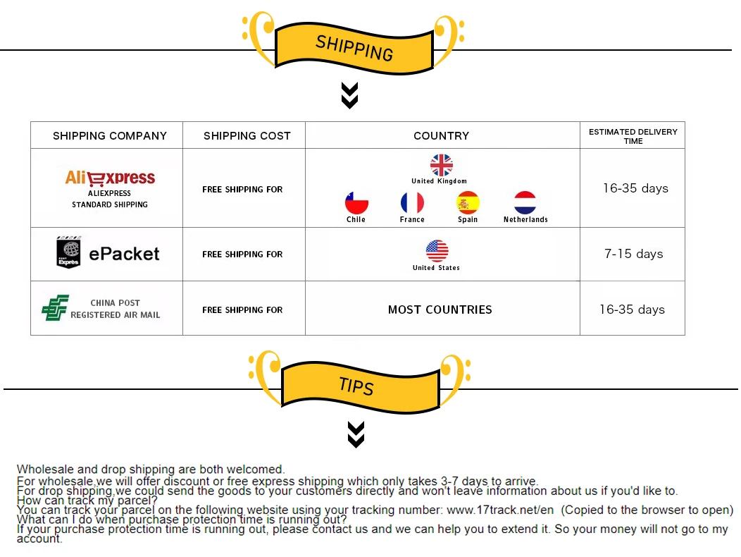Los paquetes de nuestro almacén en China se enviarán por ePacket o EMS según el peso y el tamaño del producto. Los paquetes enviados desde nuestro almacén de EE. UU. Se envían a través de USPS.